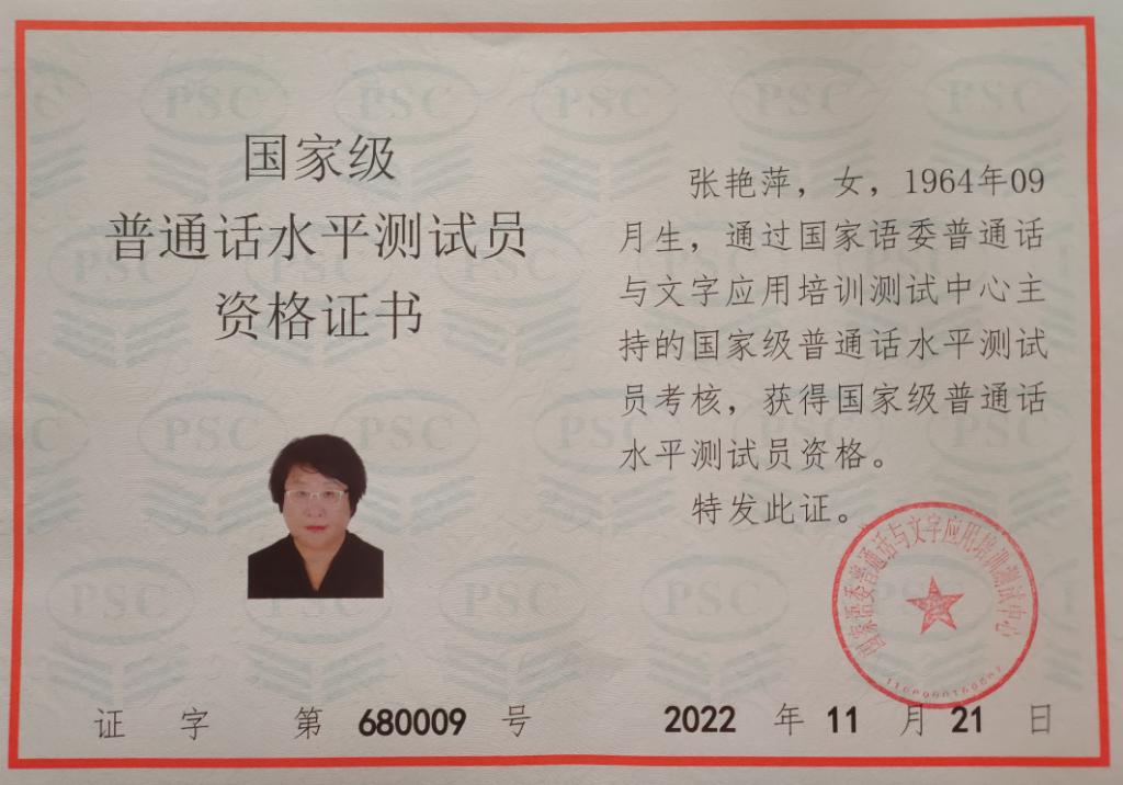 球报体育张艳萍老师获得国家级普通话测试员资格证书 张艳萍老师是河北省普通话测试员,她不断进取,努力提高自己的普通话水平,积极参加普通话测试及推广活动。2022年经唐山市语委推荐,参加了国家语委组织的国家级普通话测试员培训。疫情期间,克服重重困难,完成了两期88学时的学习并通过严格考试,顺利通过了国家级普通话水平考试和国家级普通话测试员资格考试。因疫情原因,国家语委于今年暑假期间颁发证书。